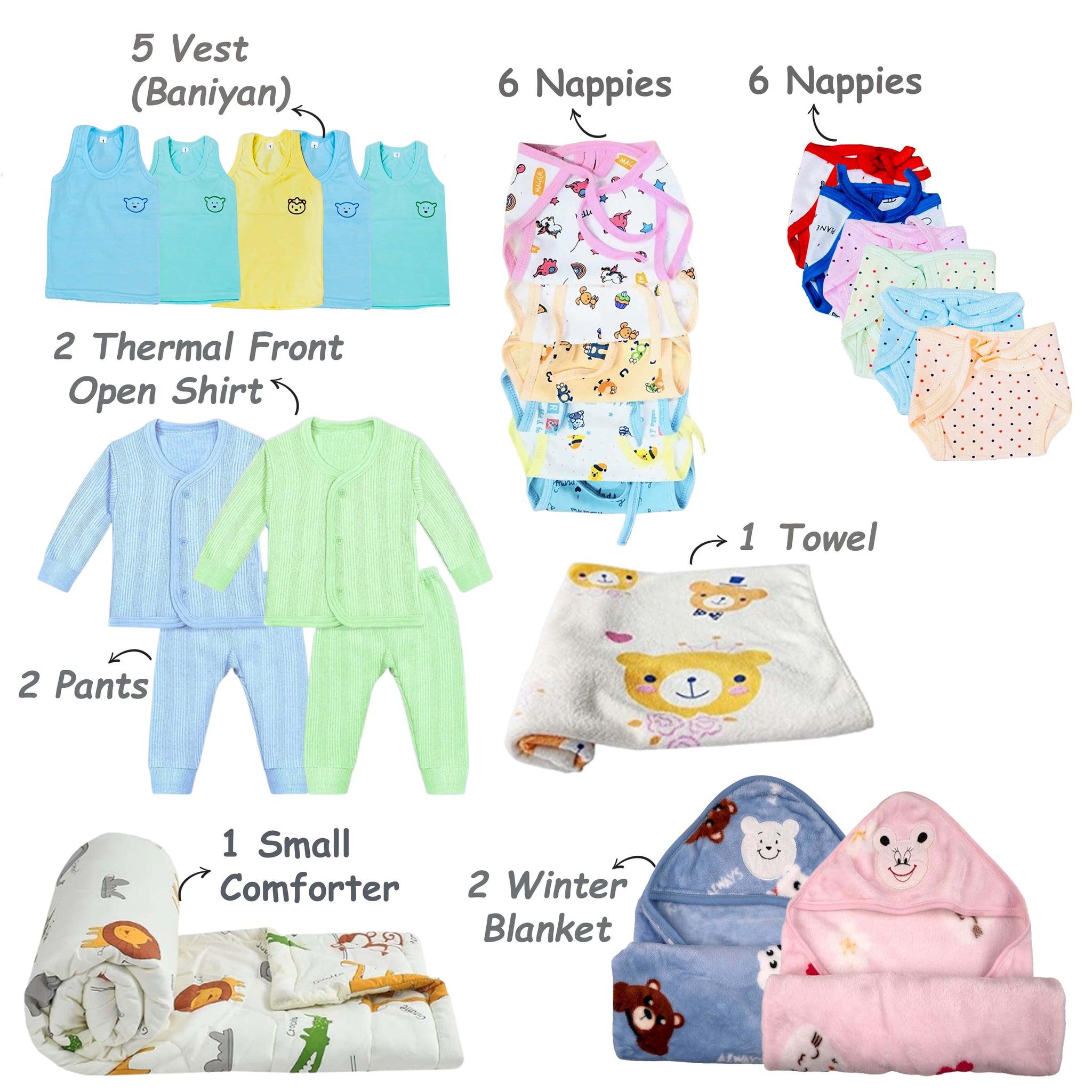 1. 4 Shirts | 4 caps | 4 nappies | 4 mittens | 4 socks (0-3M)2. 2 Shirt | 4 pajamas | 2 cap |2 bib(0-3M)3. 1 Comforter (small)4. 5 Track pants5. 1 Towel6. 4 Dry sheets7. 5 Vest (Baniyan) (0-3M)8. 2 Thermal front open shirt | 2 pants (0-3M)9. 12 Nappies10. 6 Napkins11. 2 Soft blanket12. 2 Rompers (0-3M)13. 2 Bibs14. 3 Cut sweater (0-3M)15. 6 Mittens | 6 Socks16. 1 Nursery Mother Bag17. 1 Mustared pillow 18. 2 woolen tying caps19. 2 Sweater | 2 Mittens | 2 Socks | 2 Cap (0-3M)20. 2 Caps | 2 Mittens | 2 Socks 21. 5 Full Vest22. 5 T-shirts (0-6M)23. 2 woolen hand gloves 24. 2 pairs of shoes Total items: 119Colour And Designs May Vary